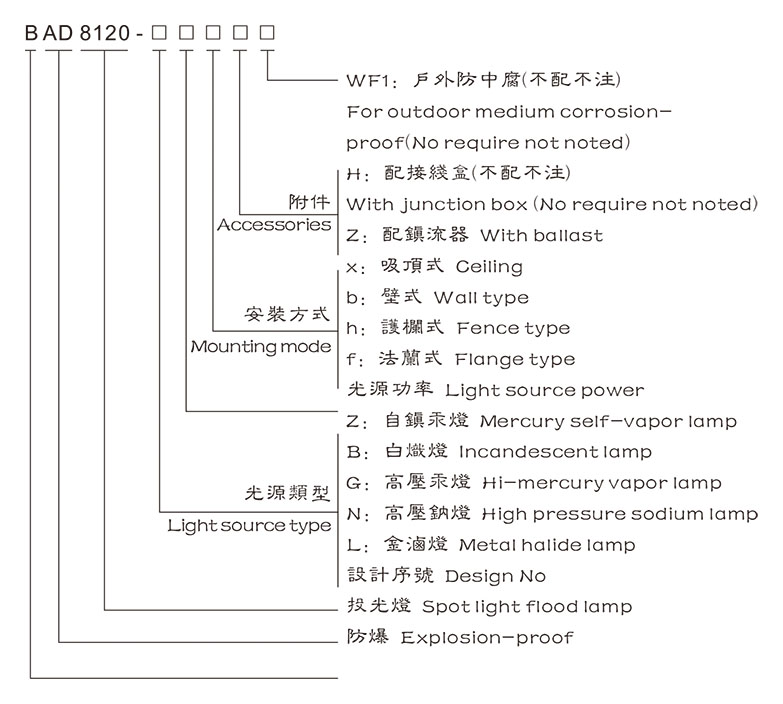1. 按照型號(hào)含義中的規(guī)則逐條進(jìn)行選擇,并在型號(hào)含義后增加防爆標(biāo)志。
