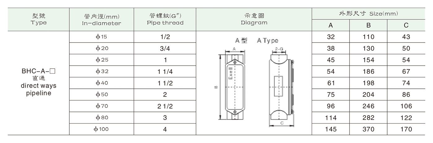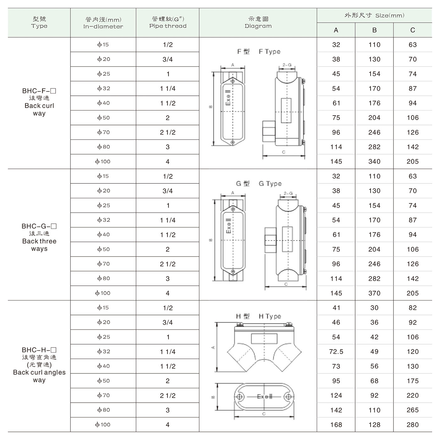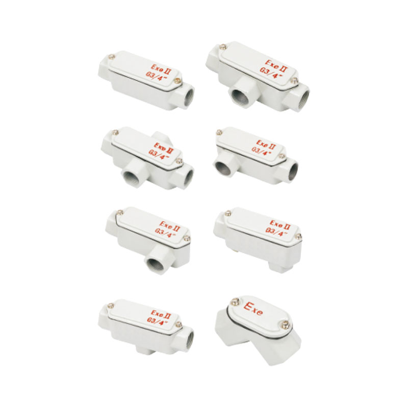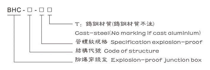 1. 按照型號含義中的規則逐條進行選擇,并在型號含義后增加防爆標志具體體現為:【產品規格型號代碼+防爆標志】,如需要防爆穿線盒A型,1/2"管螺紋、鋁合金材質、則產品型號為:【BHC-A-1/2+ExeⅡ】。