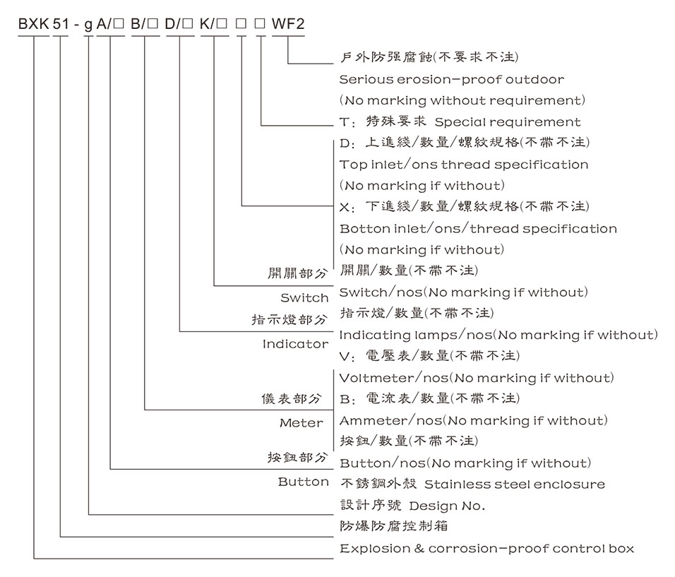 1. 按照型號(hào)含義中的規(guī)則逐條進(jìn)行選擇,并在型號(hào)含義后增加防爆標(biāo)志。