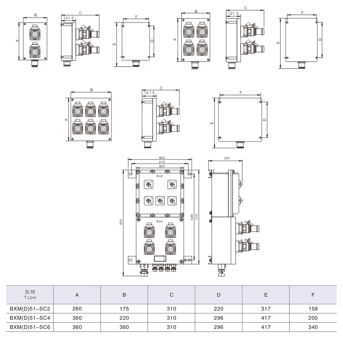 3. 箱體內裝防爆電器元件,箱壁上裝面板式防爆插座。可根據需要組成不同的回路數,不同電壓電流等;